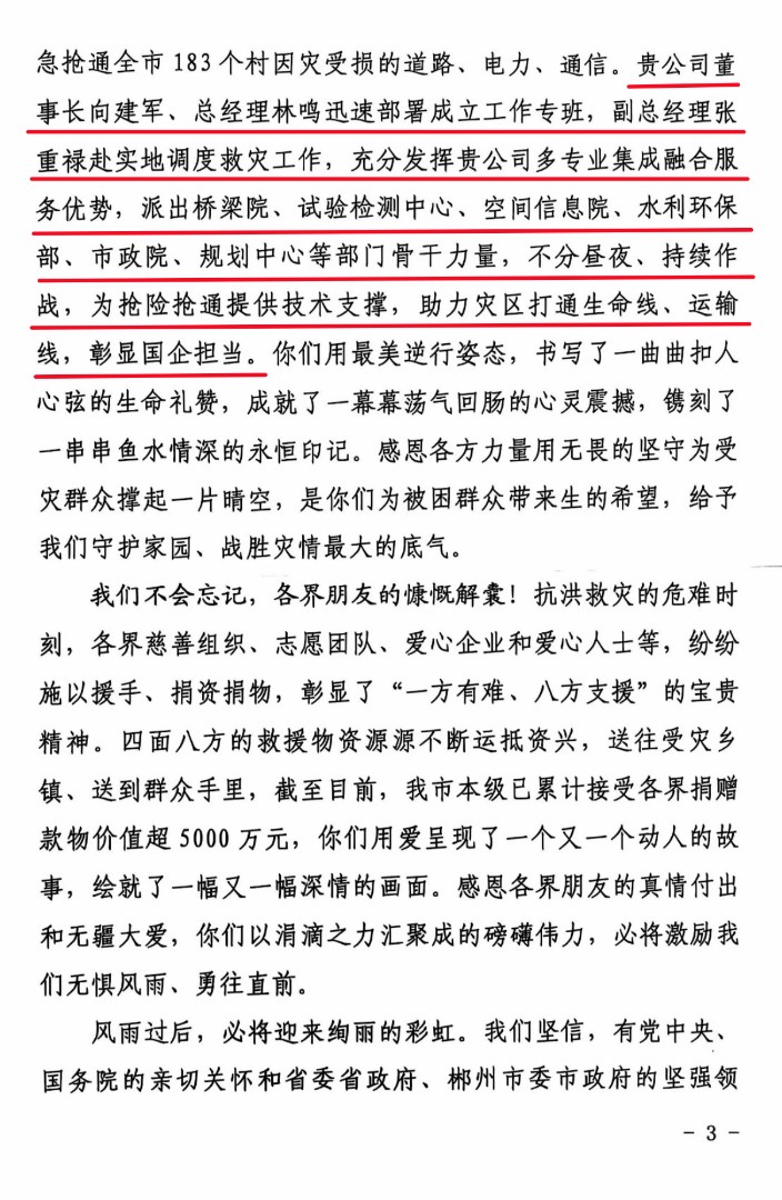 信中指出,資興市此次遭遇災(zāi)情極為罕見,多地基礎(chǔ)設(shè)施遭到嚴(yán)重損毀、大范圍交通中斷,當(dāng)?shù)厝嗣?/span>生產(chǎn)生活遭受嚴(yán)重影響。在關(guān)鍵時刻,湖南交通設(shè)計院黨委高度重視、響應(yīng)號召、極速支援,在黨委書記、董事長向建軍,黨委副書記、副董事長、總經(jīng)理林鳴的部署下,迅速成立救災(zāi)重建工作專班,派出司屬橋梁院、試驗檢測中心、空間信息院、水利環(huán)保部、市政院、規(guī)劃中心、市場中心等單位包括教授級高工在內(nèi)的技術(shù)骨干力量,抽調(diào)設(shè)備物資,全力投入。黨委委員、副總經(jīng)理張重祿赴一線實地調(diào)度,黨委委員、副總經(jīng)理、總工程師李瑜全過程督導(dǎo)。公司上下協(xié)同作戰(zhàn),以實際行動貢獻(xiàn)國企力量,彰顯國企擔(dān)當(dāng)。