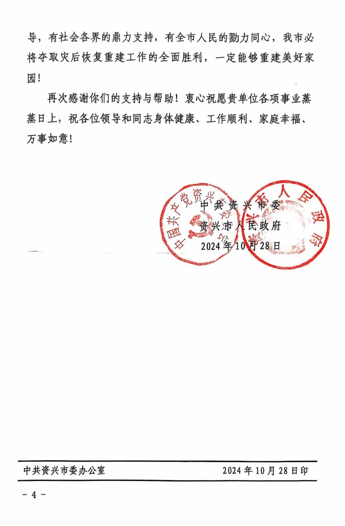 近日,中共資興市委、資興市人民政府發(fā)來感謝信,信中高度評價了湖南省交通規(guī)劃勘察設(shè)計院有限公司在馳援資興搶險救災(zāi)及災(zāi)后恢復(fù)重建工作中展現(xiàn)的擔(dān)當(dāng)精神和技術(shù)水平,對公司作出的積極貢獻(xiàn)表達(dá)了誠摯的感謝。
