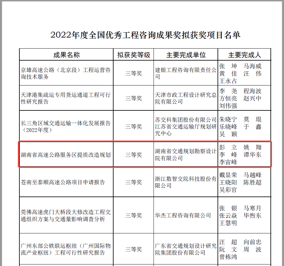 近日,中國工程咨詢協會公布了2022年度全國優秀工程咨詢成果獎獲獎項目名單,湖南交通設計院編制的《湖南省高速公路服務區提質改造規劃研究》喜獲殊榮。 全國優秀工程咨詢成果獎,是國內工程咨詢領域的最高榮譽,旨在表彰和獎勵在我國工程咨詢業務實踐中作出突出貢獻的集體...
